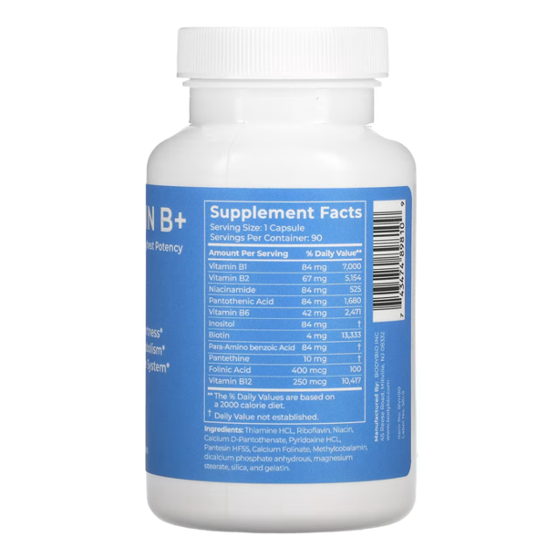 BodyBio Vitamin B+ is a premium, high-potency methylated B-complex formulated to support energy production, brain function, mood balance, and overall metabolic health. With activated forms of B-vitamins—including B6, B12 (methylcobalamin), folate (methylfolate), riboflavin & niacinamide—this supplement ensures maximum absorption and effectiveness.
