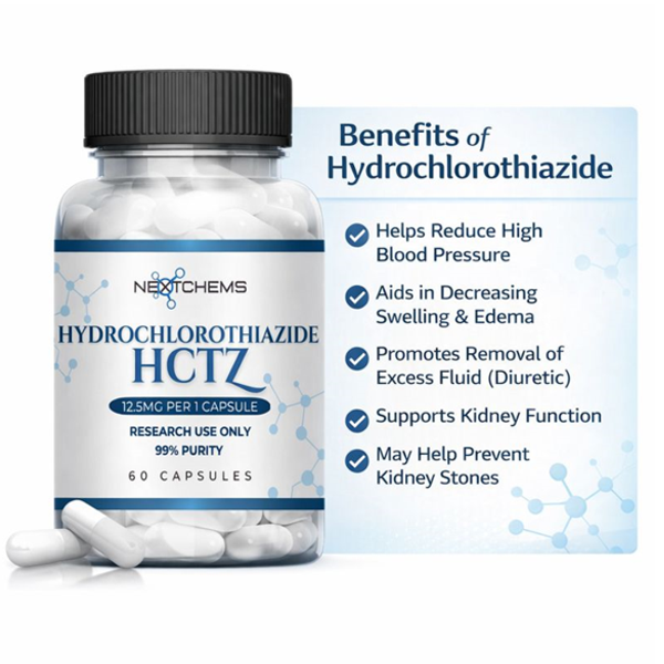 Nextchems Hydrochlorothiazide (HCTZ) 12.5mg Capsules, a prescription-strength diuretic drug, is frequently used to promote normal blood pressure levels and fluid balance. As a member of the thiazide class of diuretics, hydrochlorothiazide aids the kidneys in eliminating extra salt and water from the body, which can help control hypertension and associated fluid retention.