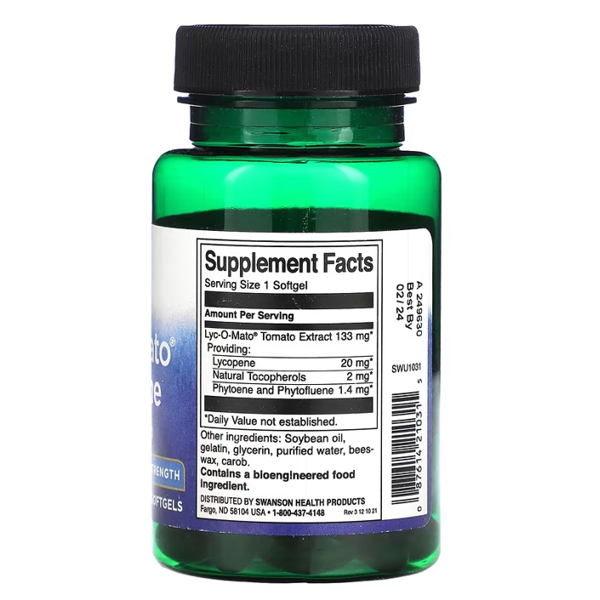 Swanson Lycopene 20mg is a premium antioxidant supplement designed to support prostate health, heart function, skin protection, and cellular wellness. Lycopene is a naturally occurring carotenoid found in tomatoes, known for its strong free-radical fighting ability.